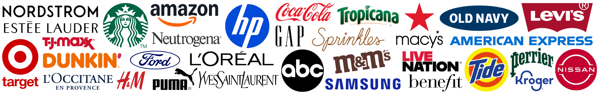 1717 Olive, ABC, Abreva, Accessorize USA, Ace Hardware, Amazon, American Express, American Greetings, Annie Sez, Arbonne, Arm & Hammer, ASPCA, Baileys, Ban.do, Bare Minerals, Barkbox, Beau Bain, Beau-Coup, Beija-Flor Brazilian Designer Jeans, Benefit Cosmetics, Big Mouth Inc., Bloke, Brooklyn Candle Studio, Caldrea, Capricorn Press, Carefree, Caress, Carolina Pad, CBS, Ceasars Entertainment, Cetaphil, Chambord, Chevrolet, Chili's, Ciaté London, Cirque Du Soleil, Citibank, Clairol, Coca-Cola, Color Me Conscious, Comet, Conair, Container Store, CoverGirl, Crystal Light, Crystal Lullaby, Dao Labs, David's Bridal, Deborah Lippman, Decoraport, Deep River Snacks, Derma E, Digi Buddha, DKNY, Dove, Due North Designs, Dunkin' Donuts, Ecco, Elf Cosmetics, Eloquii, Eminence, Enzo Mantovani, Essie, Estee Lauder, Extended Stay America, Fabulous Stationary, Fancy French Cologne, Feed My Skin, Felix + Iris, Flour Pot Cookies, Footzyrolls, Ford, Fresh & Easy, Gap, Garnier, Get Eurofied, GHD, Gilt, Glossier, Gold Canyon Candles, Guerlain, Guy and Eva, Gypsy Junkies, H&M, HarperCollins, Harrah's, Harry Barker, Herbivore Botanicals, Hollywood Fashion Secrets, Hornitos, House of Telsa, HP, Intel, Ivana Helsinki, Jasmere, JCK Jewelry Trade Show, JCPenney, Jewelmint, Jillian Maddie Paperie, John Frieda, Julianna Rae, Just Cavalli, Kaur Collection, Kitsch, Kmart, Kraft, Kroger, Kypris, L.A.B. 2, L'Bel USA, L'Occitane, L'oreal, Lane Bryant, Lazybonezz, Levi's, Lifetime, Lily B. Skincare, Live Nation, Love With Food, Lush, Luxe Link, M&M’s, Macy's, Maidenform, Makeup Forever, Malin + Goetz, Malvi, Maximal Art John Wind, Maybelline, Medjet Assist, Mod Podge, Motorola, Mrs. Field's, Mt. Bachelor Village Resort, My Mind's Eye Paper Goods, Nerium, Nest Pretty Things, Neutrogena, Nissan, No Nonsense, Nordstrom Rack, Nutraluxe MD, O Hotel, Oilogic, Olay, Old Navy, Olivia + Joy, Ozone Socks, Pacific Jewelry Designs, Pantene, Paper Source, Papyrus, Paradise Point Hotel, Paris Las Vegas, Perrier, Philip B, Philips, Plie, Poise, POP Beauty, Poppin, Poshlocket, Pretty Plum Sugar, Puma, Pur Minerals, Quest Nutrition, Rebecca Minkoff, Redfin, Reebok, Rembrandt, RGB Cosmetics, Rifle Paper Co., Rimmel London, Rio Las Vegas, Rosetta Books, Rumba Time, Running Press, Sally Hansen, Samsung, Savers, Savvy Travelers, Scentsy, Schick, Seed Power Body Care, She's Happy Design, Shop It To Me, Simple Skincare, Skinny Cow, Smashbox Cosmetics, Smashmallow, Smith & Cult, Soap & Paper Factory, Sock It To Me, Sole Society, Sony, Sorel, Sparkling Ice, Spa Week, Sprinkles Cupcakes, Starbucks, Stowaway Cosmetics, Style369, Sugar Factory, Tangle Teezer, Target, Tartan + Twine, Tazo, TechTotes, Ted Baker, Tepper Jackson, The Body Shop, The Brag Company, The Outnet, Tide, TJ Maxx, TMinx, Tommy Hilfiger, Toms, Tropicana, Trudeau, Urban Decay, Urban Revisions, Urbanears, Very, Vogue, Vous Vitamins, Weight Watchers, Whish Beauty, Wisdom Panel® Canine DNA Test, Workman Publishing, Yves Saint Laurent, YMI Jeans, Yoobi, Yours Clothing, Zoya